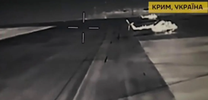 "Черговий результат системної бойової роботи спецпідрозділу ГУР МО України "Примари" на території тимчасово окупованого Криму: добрими дронами вгатили по авіабазі російських загарбників у Гвардійському, неподалік Сімферополя - успішно уражено два ворожі гелікоптери Мі-8", - розповіли розвідники.